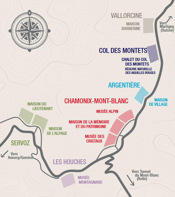 In Servoz ist das Maison du Lieutenant ein unumgänglicher Ort, um das Leben von früher zu verstehen: Landwirtschaft, Transhumanz, Bergberufe und traditionelle Architektur. In Vallorcine bietet dasEspace Mont-Blanc wechselnde Ausstellungen über das grenzüberschreitende Leben und die Geschichte des Mont-Blanc-Landes. In Les Houches stellt das Musée Montagnard Innenräume aus der damaligen Zeit nach und bietet eine Reise in das Alltagsleben der Bergbewohner von einst. Diese Museen bieten viele Gelegenheiten, ein erhaltenes und spannendes Kulturerbe zu entdecken.