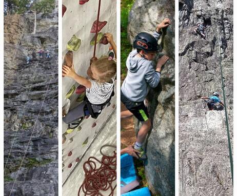 von 4 bis 15 Jahren, alle Niveaus: Anfänger oder bereits Fortgeschrittene, jeden Tag ein anderer Ort: Klippen, seilfreie Blöcke im Freien, Kletterhalle...