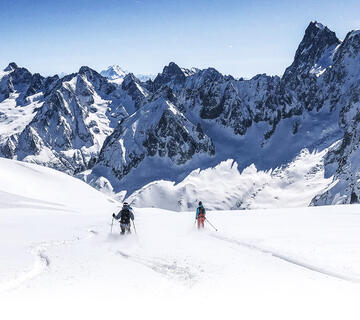 Das Tal von Chamonix-Mont-Blanc ist ein berühmter Ort für Skifahrer abseits der Pisten und bietet eine Vielzahl von Skitouren und Freerando-Ausflügen. Es ist bekannt für seine Schneesicherheit und die Vielfalt seines Geländes, aber auch für die symbolträchtigste Gletscherabfahrt der Welt: das Vallée Blanche.