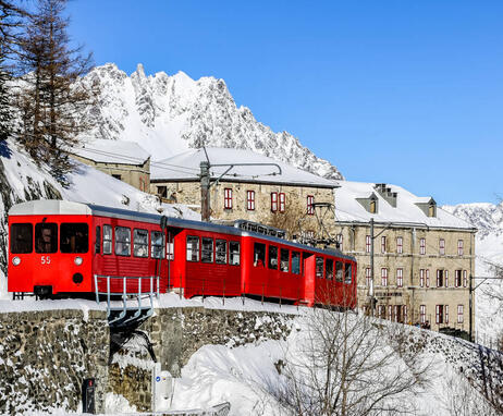 Die berühmte kleine Zahnradbahn bringt Sie von Chamonix aus zu dem auf 1913 m gelegenen Montenvers. Von hier aus bietet sich Ihnen ein grandioses Panorama auf den Mer de Glace-Gletscher, Les Drus und Grandes Jorasses.