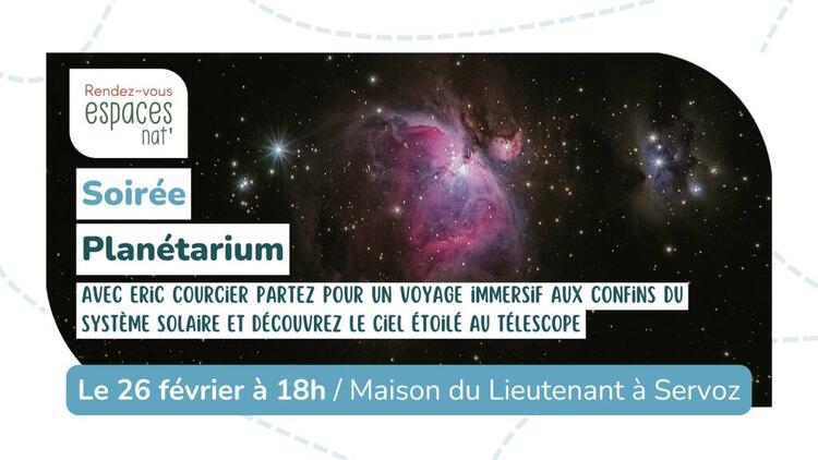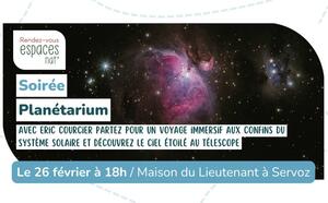 In Begleitung von Eric Courcier, einem leidenschaftlichen Astronomen, treten Sie durch die Tür des Planetariums und begeben sich auf eine immersive Reise bis an den Rand des Sonnensystems. Wenn der Himmel klar ist, wird der Abend im Freien fortgesetzt, wo Sie den Himmel mit einem Teleskop beobachten können.