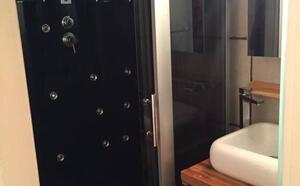 Badezimmer mit XXL-Duschkabine, Haartrockner und Waschmaschine.
