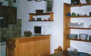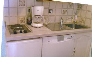 Kochecke: Geschirrspüler, Mikrowelle, Kochplatten, Kaffeemaschine, Raclettegerät.