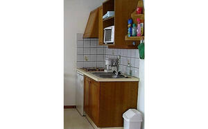 Eingang, Sitzecke mit Klappsofa, ausgestattete Küchenzeile mit Esstisch.