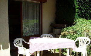 Nach Süden ausgerichtete Terrasse mit Tisch und Stühlen.