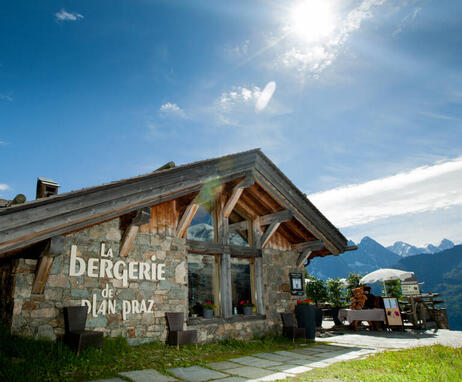 Moderne Brasserie mit Holzfeuer, zwischen Savoyen & Italien. Südterrasse mit Blick auf den Mont Blanc