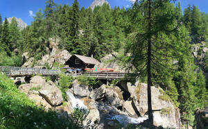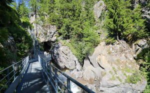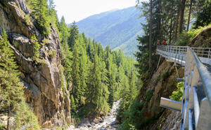 Ein neuer Steg erwartet die Besucher am rechten Ufer des Wildbachs. Hier können Sie die wilden Fluten, die von den Aiguilles Rouges herabstürzen, ganz aus der Nähe betrachten.