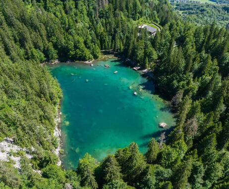 Der Lac Vert liegt auf 1200 m Höhe und bietet smaragdgrünes Wasser von seltener Klarheit, das von Fichten gesäumt wird. Dieses unter Naturschutz stehende Gebiet, in dem sich der Mont Blanc spiegelt, ist ideal für einen ruhigen Spaziergang in einer geschützten Umgebung.