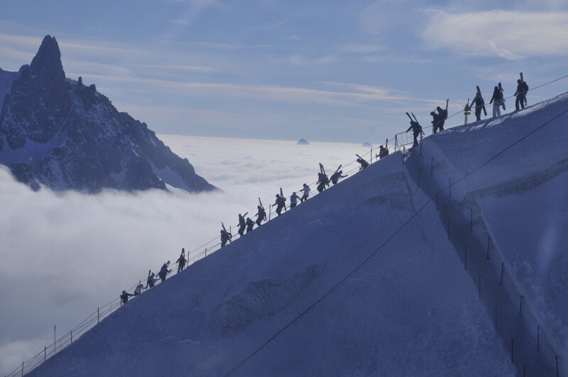 Pour les skieurs, l’Aiguille du Midi représente une porte d’entrée vers les vastes étendues vierges du ski hors-piste. En regardant à travers les vitres, vous pourrez deviner la silhouette de quelques skieurs expérimentés sur la voie "Mallory-Portery", une descente vertigineuse avec une inclinaison de la pente jusqu'à 55 degrés : âmes sensensibles s'abstenir !