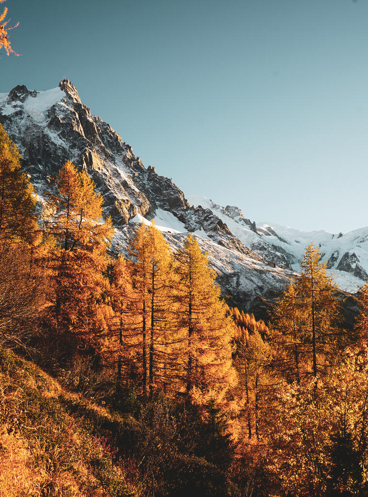 Dies ist die ideale Jahreszeit für Naturliebhaber, aber auch für alle, die das Bedürfnis verspüren, dem Alltag zu entfliehen: Zwischen sauberer Luft und grandiosen Landschaften fällt es leicht, sich wieder mit dem Wesentlichen zu verbinden, und nichts ist besser, um neue Energie zu tanken. Die Wälder aus Lärchen, Buchen und Birken schimmern in Nuancen von Goldgelb, Orange bis Rot. Alle Gipfel des Mont-Blanc-Massivs sind bereits von Natur aus schneebedeckt, was einen starken Kontrast zwischen den warmen Herbstfarben der Wälder und den kältesten Eisspitzen bietet. Ein einzigartiges Panorama, wie es sonst nirgends zu finden ist!