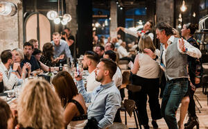 Ein Moment des Teilens zwischen Küche und künstlerischer Show, die Gesang und Tanz vereint, um alle zu erfreuen.