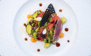 Unter dem Glasdach befindet sich der Gästetisch. Der Blick schweift über das Mont-Blanc-Massiv. An diesem eleganten und gemütlichen Ort, der von Sybille de Margerie entworfen wurde, braucht man keine Angeberei. Nur die Zähmung des Wilden, die Finesse und die saisonalen Produkte. Die Tradition respektieren, ja, aber keine Langeweile aufkommen lassen! Chefkoch Mickey Bourdillat beschränkt seine Inspiration nicht auf die Produkte der schönsten französischen Alpentäler. Seine Küche ist eine Reise durch die Alpen, das Aostatal und sogar den Mittelmeerraum. Jedes Gericht auf der Saisonkarte ist eine Einladung zum Teilen und zur Geselligkeit, Werte, die den Bergbewohnern und dem Küchenchef so sehr am Herzen liegen.