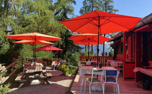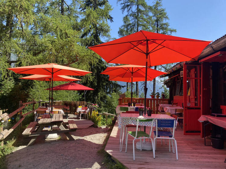 Sie bietet kühle Getränke und Snacks, die auf der Terrasse gegenüber dem Bossons-Gletscher genossen werden können.
