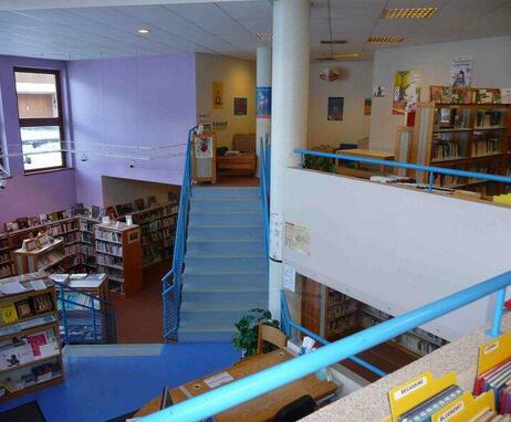 Die Bibliothek befindet sich in einem 200m² großen Raum auf zwei Ebenen (Erdgeschoss für Erwachsene und 1. Stock für Jugendliche). Sie ist an die Schulgruppe angebaut und befindet sich direkt neben dem Espace Olca.