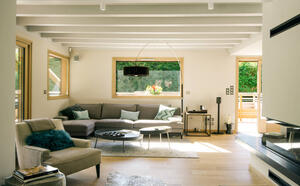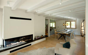 Der unglaublich helle Wohnbereich mit Blick auf den Mont Blanc wird von einem modernen Kamin geschmückt.