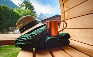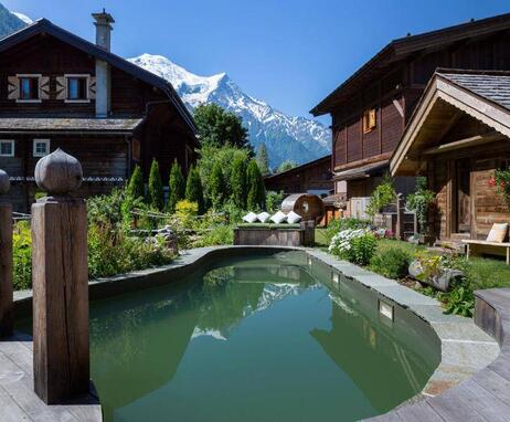 Der Wellnessbereich im Freien ist einzigartig in Chamonix: "Le Jardin Alpin" ist ein wahrer Sinnesparcours. Luft, Wasser und Pflanzen umgeben ein Biotopbecken, kleine Mazots, die als Saunen dienen, und einen Jacuzzi. Der Zugang zu den Saunen ist bei Zimmerreservierungen im Hotel kostenlos!